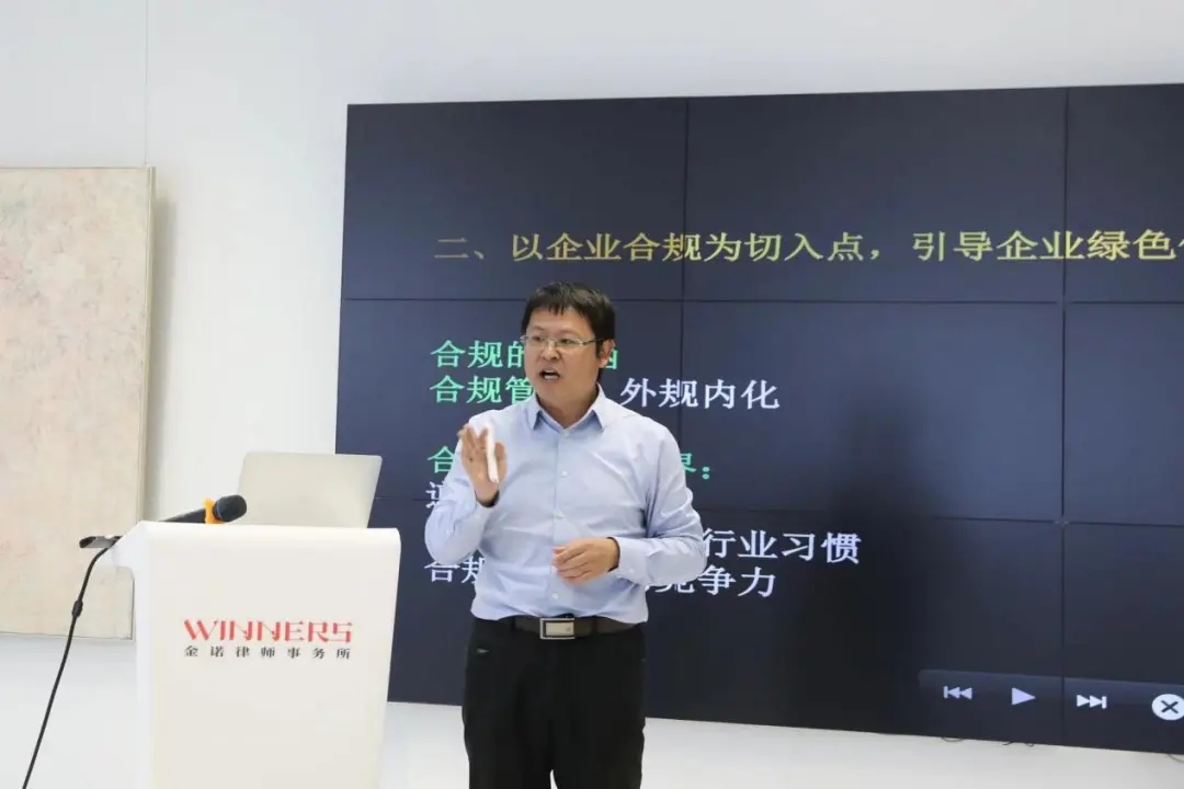 金诺律师事务所环境部高级顾问申进忠教授也出席了本次交流会,申老师立足于环境部的专业领域,阐述了律所与商协会“助力经济社会发展全面绿色转型”的合作模式。从国务院给出的工作意见出发,以习近平新时代中国特色社会主义法治思想为指导,以企业合规为切入点,引导企业绿色低碳转型。