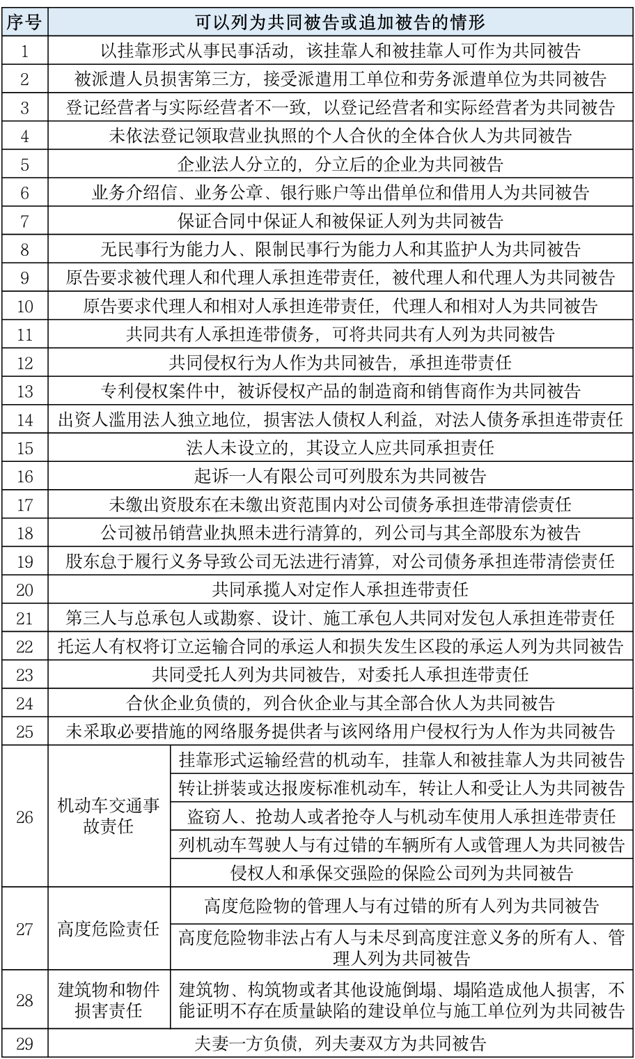 笔者根据《中华人民共和国民法典》(以下简称“《民法典》”)、《中华人民共和国民事诉讼法(2021修正)》(以下简称“《民诉法》”)、《最高人民法院关于适用<中华人民共和国民事诉讼法>的解释(2022修正)》(以下简称“《民诉法解释》”)等相关规定,结合司法案例,梳理民事诉讼中可以列为共同被告或追加共同被告的类型,以期能更为具体宏观的体现诉讼中共同诉讼主体的情形。考虑到整体篇幅与内容,笔者分为上中下三篇对共同被告情形进行整理。